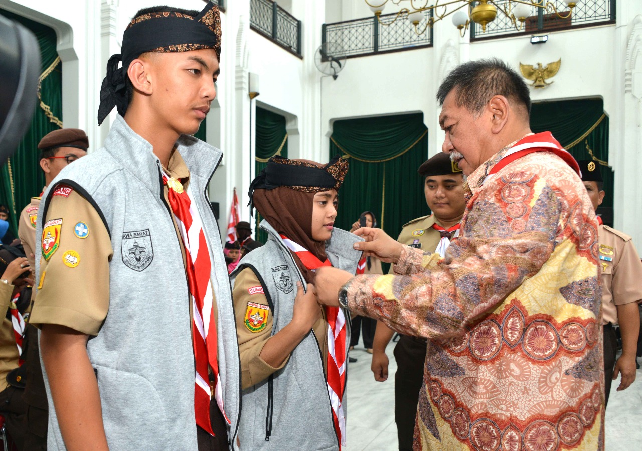 BANDUNG – Wakil Gubernur Jawa Barat Deddy Mizwar (Demiz) melepas peserta Raimuna Nasional XI Tahun 2017 asal Jawa Barat di Aula Barat Gedung Sate, Jl. Diponegoro No. 22, Kota Bandung, Jumat pagi (11/8/17). Raimuna Nasional merupakan kegiatan pertemuan besar Pramuka anggota Penegak yang berusia antara 16-20 tahun dan anggota Pandega usia 21-25 tahun.