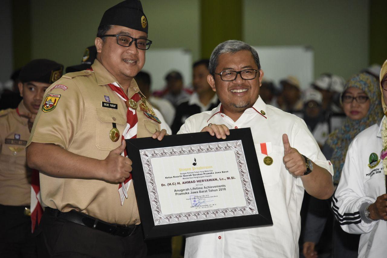 Dalam pembukaan Porpemprov XIV Aher memberikan penghargaan dan uang kadeudeuh bagi ASN berprestasi di ajang Pornas Korpri.