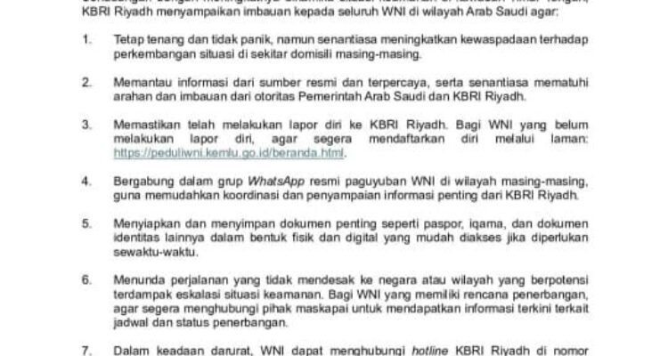 Kedutaan Besar RI Berikan Imbauan Terhadap WNI yang Berada di Arab Saudi Berita Tulisan, International|February 28, 2026by Seputar News Seputarnews.com / Arab Saudi –