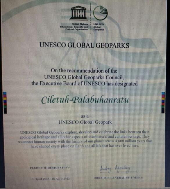 BANDUNG — Sertifikat Unesco Global Geoparks(UGG) bagi Ciletuh-Palabuhanratu telah terbit. General Director of Unesco, Audrey Azoulay, menandatangani langsung sertifikat tersebut. Dengan demikian lengkap sudah legatlitas Geopark Ciletuh-Palabuhanratu, Kab. Sukabumi, Jawa Barat sebagai bagian dari ‘keluarga besar’ UGG di dunia, yang empat diantaranya berada di Indonesia.